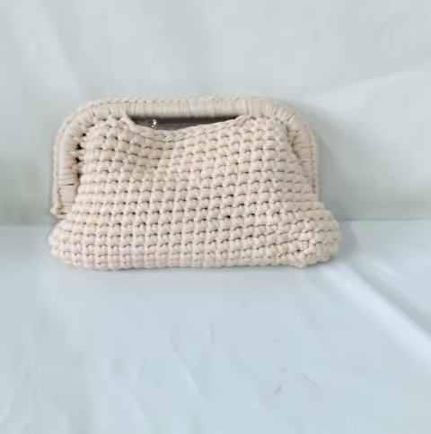 Questa pochette artigianale all'uncinetto combina qualità superiore e design raffinato. Realizzata a mano con materiali pregiati, offre una struttura semplice e versatile. Dotata di una pratica clip e di una catena elegante, è ideale come borsa da viaggio per donne che cercano stile e funzionalità in un unico accessorio.